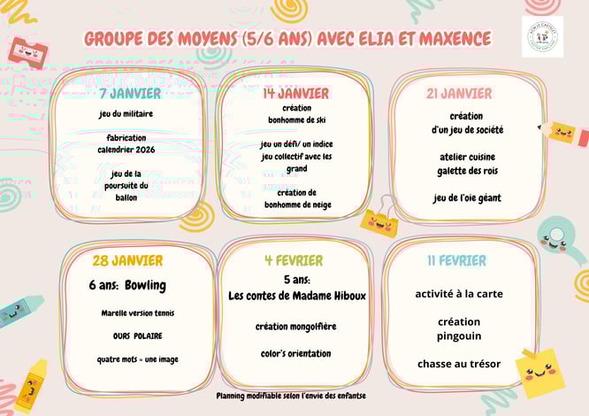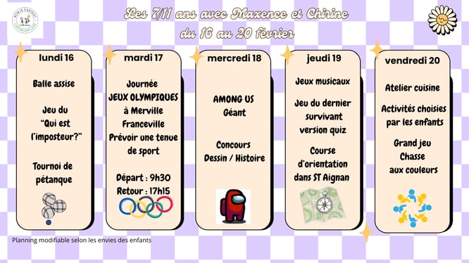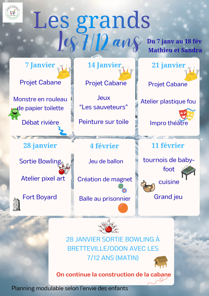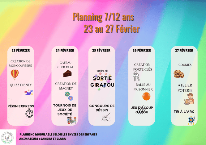 Le Centre de Loisirs est ouvert tous les mercredis et pendant les vacances scolaires de 7h30 à 18h30.